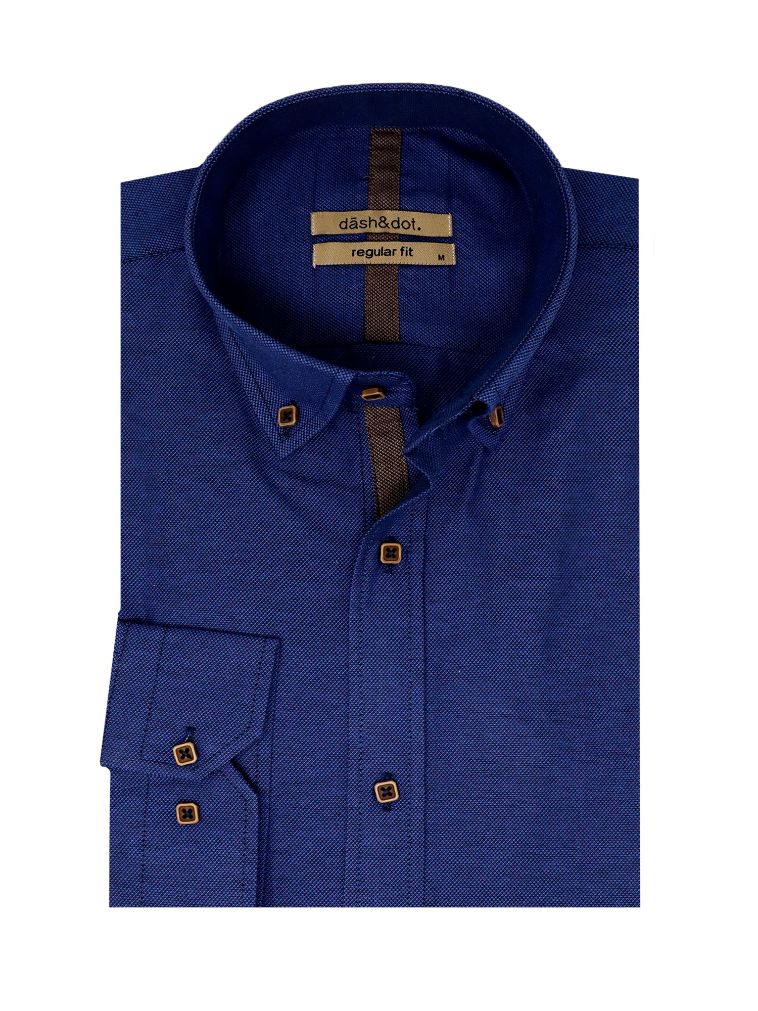 Αυτό το ανδρικό μπλε πουκάμισο Regular Fit ξεχωρίζει για το κομψό ύφασμά του και τις ιδιαίτερες λεπτομέρειες στα κουμπιά, δίνοντας μια προσεγμένη, αναβαθμισμένη εμφάνιση σε κάθε άνδρα.